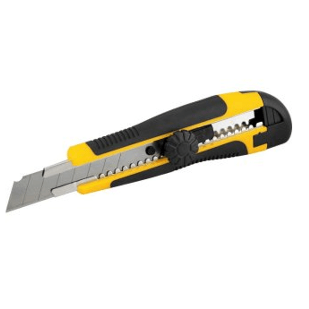 Possui corpo em plástico reforçado com revestimento em borracha termoplástica, oferecendo conforto e segurança no manuseio, além de guia metálica e trava giratória da lâmina. Lâmina segmentada em 7 partes com compartimento para reposição, indicada para cortes em geral.